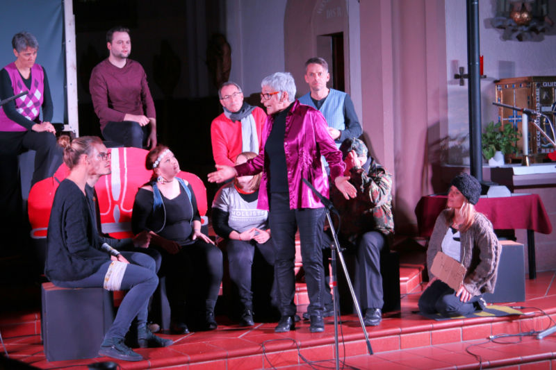 Es war sicherlich kein leichtes Thema, welches die PAROLE gemeinsam mit der Band und Singgruppe Hoffnungsschimmer in der Pfarrkirche St. Jodokus am ersten Fastensonntag auf die Bühne gebracht hat. Die Beschäftigung mit dem Tod ist keine bequeme, und doch ist es eine notwendige, wie der Wandel der Figuren in Kurt Roses Bühnenstück "Nicht nur an jenen drei Tagen" aufzeigt. Waren sie anfangs noch bestrebt, den Tod, dieses Hindernis, diese Störung, ein für alle Mal aus der Welt zu schaffen, sei es durch Technik, sei es durch Medizin, so siegte doch schließlich die Einsicht: Den Tod kann man nicht verkaufen. Jeder stirbt, jeder stirbt seinen eigenen Tod. Der Tod ist unumgänglich.